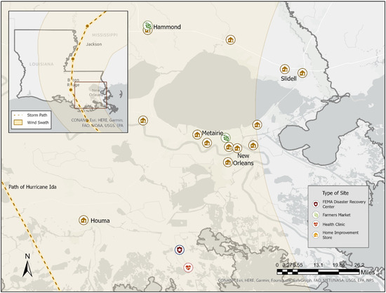 Hurricane Ida, a Category 4 hurricane, made landfall in southern Louisiana on 29 August 2021 on the 16th anniversary of Hurricane Katrina, which hit approximately the same area [1]. With maximum sustained winds of 150 mph, Hurricane Ida caused widespread damage to homes and businesses, including heavy flooding and power outages lasting up to three weeks [2]. Ida was the sixth costliest hurricane on record in the United States, causing at least USD 75 billion in damages [3]. News media reported 91 deaths attributable to Hurricane Ida, 28 of which were in Louisiana [4]. In the weeks following the hurricane, the US Army Corps of Engineers installed over 33,600 reinforced plastic tarps on the roofs of damaged homes in 25 Louisiana parishes (a territorial division that is synonymous with “county” in other states). In Louisiana, the Federal Emergency Management Agency (FEMA) approved more than 563,500 applications for individual assistance and operated 40 Disaster Recovery Centers where residents could apply for disaster assistance, check the status of their assistance applications, and obtain other disaster-assistance-related information [5].