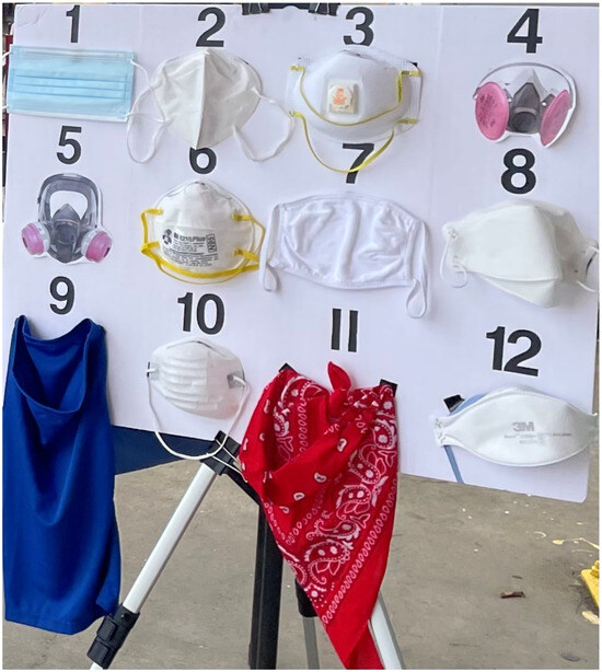 Display of items shown to participants. From the upper left, the items are (1) surgical mask; (2) Dongguan Sengtor Plastics Products Co. KN95 Particulate Disposable Respirator (Dongguan City, Guangdong Province, China); (3) 3M™ 8511 N95 Particulate Disposable Respirator with Valve (Aberdeen, SD, USA); (4) photo of a 3M™ Half Facepiece Respirator with Cartridge; (5) photo of a Honeywell 2760008A Full-Face Respirator; (6) 3M™ 8210 Plus N95 Particulate Disposable Respirator (Aberdeen, SD, USA); (7) cotton cloth face mask; (8) Kyungin Flax KF94 (Incheon, South Korea); (9) polyester neck gaiter; (10) dust mask; (11) cotton bandana; (12) 3M™9205 N95 Particulate Disposable Respirator (Aberdeen, SD, USA).