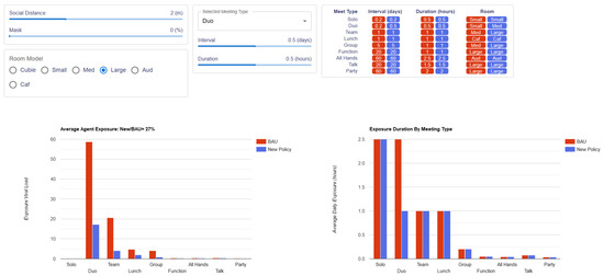 User interface for exposure simulation. Fixed “Business As Usual” (BAU) policy parameters are highlighted in red, while user-adjustable parameters for the new policy are shown in blue. (Top left) Two sliders control social distancing (1 to 4 m) and the mask-wearing population (0 to 100%). Below these sliders, six radio buttons allow for the selection of the meeting room. (Top middle). A dropdown menu is used to select the meeting type, which adjusts the meeting room interval, duration, and room type. (Top right) The interface displays the meeting type, duration, and room settings for both the BAU and user-defined new policies. (Bottom left) A bar graph shows the average agent exposure, in arbitrary units of viral load, for each meeting type under the BAU policy (in red) and the user-defined policy (in blue), with the ratio of new to BAU exposure displayed as a performance metric. (Bottom right) Bar graph displaying exposure duration, in hours, by meeting type. In this example, agents under the new policy experience 27% of the exposure seen under the BAU policy (a 73% reduction), achieved by upgrading all meetings to larger rooms (where possible) and reducing the intervals of duo meetings from five times a day (interval = 0.2) to twice a day (interval = 0.5).