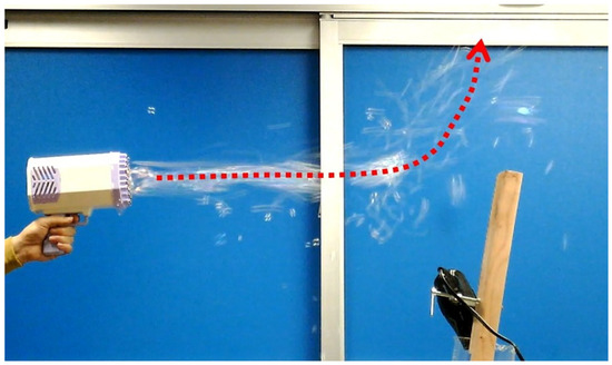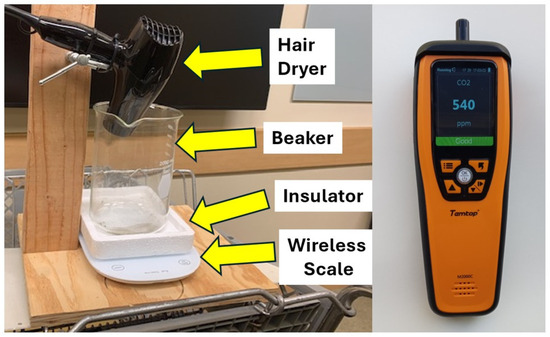 The CO2 generator (Figure 2) produces a plume of rising air and CO2 mixture (Figure 3), which is dispersed throughout the room by air currents. The 2-L Pyrex beaker of the generator is filled with crushed dry ice. The mass is wirelessly monitored with a scale (Arboleaf Model CK10G) with insulation to protect it against the extreme cold of dry ice (−78 °C). A 1500 W hair dryer positioned above the beaker directs a stream of hot air onto the dry ice, sublimating and heating the released CO2 gas. Without this warming, the dense cold CO2 gas would sink to the ground [33].
