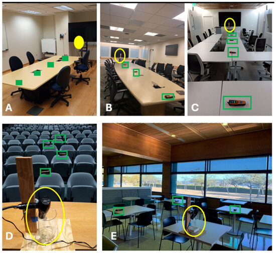 Rooms used to characterize mass transfer fraction using CO2 tracer gas. CO2 generator is indicated by yellow ovals. CO2 sensors are indicated with green rectangles. (A) Small room (B) Medium room (C) Large room (D) Auditorium with CO2 generator on stage with CO2 sensors placed on the top of chairs in successive rows. (E) Cafeteria with CO2 generator on table, CO2 sensors on adjacent tables.