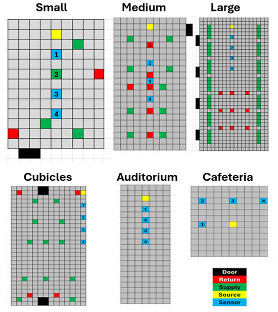 Room floor plans. The rooms are arranged clockwise from the top left: Small, Medium, Large, Cafeteria, Auditorium, Cubicles. The color key is as follows: black represents doors, red indicates the return air (drawn from the room), green indicates the supply air (delivered to the room), yellow indicates the CO2 generator, and blue indicates the CO2 sensors. The four CO2 sensors are indicated by numbers 1, 2, 3, and 4. In the small room (top left), CO2 sensor 2 is color-coded green instead of blue, for it is under a supply air duct. Each square represents a 25″ ceiling tile (0.635 m). The locations of all features are rounded to the nearest ceiling tile.