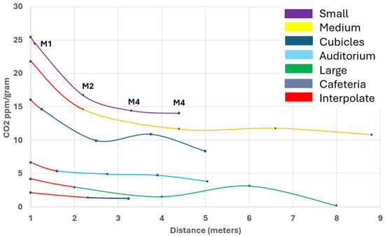 The mass transfer fraction of CO2 (ppm/gram) detected as a function of distance was determined for six rooms (Figure 6) calculated from the data collected from tracer gas experiments (Figure 7).