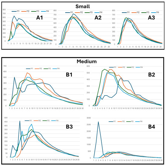 Calibrating the rooms by releasing CO2 yielded unexpected results. Initially, we anticipated the small room would behave as a well-mixed space, with a relatively uniform CO2 concentration throughout. However, a sharp decline in CO2 concentration in the first two meters from the CO2 generator was detected (Figure 6, sensors M1 and M2). Reviewing the sensor data for the small room (Figure 7A1–A3), this is due to low CO2 concentration in the distant sensors M3 and M4 in the first run (A1), as if fresh air were displacing CO2-laden air, or the current that drives CO2 toward the sensors diminished. This pattern does not repeat in the two subsequent runs, A2 and A3, which more closely resemble a mixed model, as all four sensors (M1 to M4) report substantially similar CO2 concentrations.