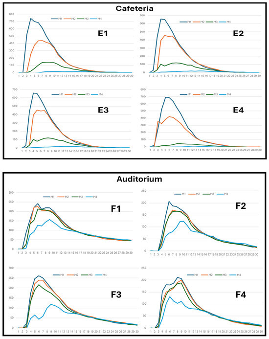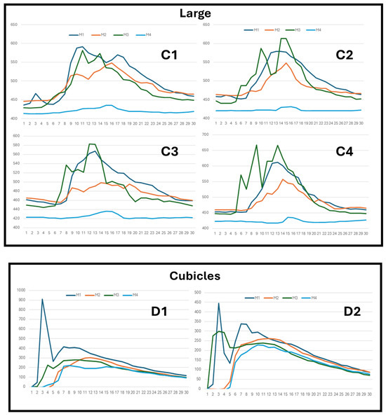 In the large room (Figure 7C1–C4), we detected unexpected peaks at sensor M3 of a magnitude greater than sensor M2, which is closer to the source. We suspect this might be due to turbulent flow caused by the meeting of air from source vents on both sides of the room (see vent locations on Figure 6).