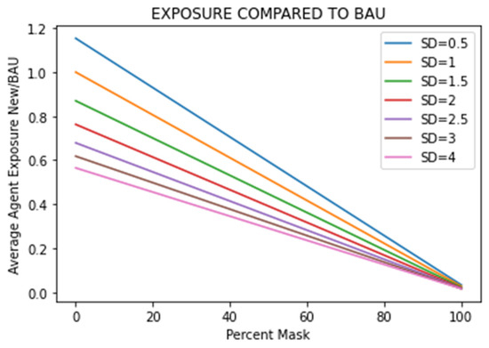 To compare the impact of social distancing and masking combinations, seven social distances (0.5, 1, 1.5, 2, 2.5, 3, and 4 m) were evaluated over the full range of mask wearing (0 to 100%) (Figure 8). Without wearing masks, social distancing of 2 and 3 m reduces average agent exposure by 24% and 38%, respectively, demonstrating the effectiveness of social distancing in reducing exposure.