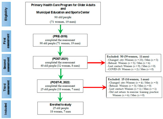 As shown in Figure 1, the total number of volunteers enrolled in this study was 25, lower than the value of the sample calculation, since among the 90 older people eligible for the study in 2019 (PRE), only 25 completed the two subsequent assessments (POST and POST-TR). In order to clarify this point, in the period between 2019 and 2022, 53 women and 12 men were excluded for one of the following reasons: refusal to be evaluated, changing city address, having had COVID-19, being unable to be located or not having returned to supervised physical training. Additionally, it is important to mention that no volunteer reported or even presented manifestations of anxiety/depression or even alteration in their cognitive level, as well as clinical manifestations of severe COVID and post-COVID syndrome during the study period.