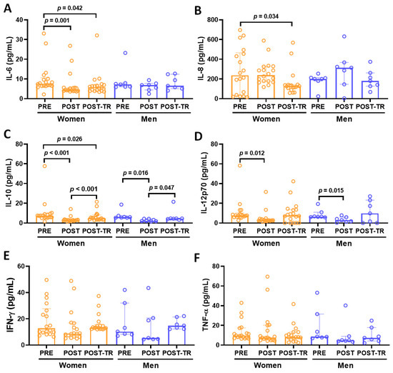 Serum cytokines levels, presented in median and interquartile range, of IL-6 (A), IL-8 (B), IL-10 (C), IL-12p70 (D), IFN-γ (E), and TNF-α (F) in the volunteer groups (older women and older men) before COVID-19 pandemic (PRE) after 12 months of interruption (POST, detraining phase) and also after 10 months of resuming of regular practice of combined exercise training program (POST-TR). The significant level was set as 5% (p < 0.05).