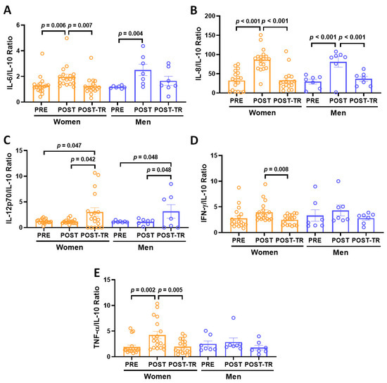 Figure 3 shows the ratios between pro-inflammatory cytokines and IL-10. At POST, whereas both groups presented a significant increase in the ratios of IL-6/IL-10 (Figure 3A, older women—ES = 0.52; older men—ES = 1.49) and IL-8/IL-10 (Figure 3B, older women—ES = 1.41; older men—ES = 1.38), a higher TNF-α/IL-10 ratio (Figure 3E, ES = 0.76) was observed in the older women than at PRE. In contrast, at POST-TR, not only the older women presented lower ratios of Il-6/IL-10 (Figure 3A, ES = 0.58), IFN-γ/IL-10 (Figure 3D, ES = 0.69), and TNF-α/IL-10 (Figure 3E, ES = 0.77), but also both groups showed a reduced IL-8/IL-10 ratio (Figure 3B, older women—ES = 1.06; older men—ES = 1.34) compared to POST. The IL-12p70/IL-10 ratio (Figure 3C) was higher in both groups at POST-TR than at PRE (older women—ES = 0.62; older men—ES = 0.77) and POST (older women—ES = 0.64; older men—ES = 0.71). Supplementary Table S1 shows all values of serum cytokine levels and the ratios.
