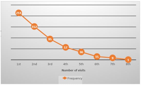 More than half of the women were multigravida (58.9%), meaning they had been pregnant two to four times. Primigravida (21%) and grand multigravida (20.1%), meaning being pregnant for the first time and being pregnant for more than four times, respectively, were almost equally distributed. The timing of ANC booking was late for most of the women, with only 16.8% of them booking in the first trimester. Nearly half of them booked in the second trimester (47.7%) and more than a third booked in the third trimester (35.5%). Furthermore, the number of ANC contacts was recorded, whereby it was revealed that only 20.4% of women were able to attend four or more ANC contacts and 0.46% had eight contacts with the midwives. The cumulative total number of ANC contacts made at the mobile clinic during the study period was 579. Table 1 provides details regarding the timing of ANC bookings in gestational age (GA) weeks and Figure 1 provides the number of visits for each ANC contact.