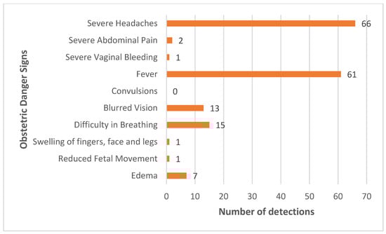 During the mobile clinic service provision, we were able to assess obstetric danger signs and detect high-risk pregnancies. The majority of women in the study experienced severe headache (n = 66) and fever (n = 61) as danger signs during pregnancy. Other symptoms, such as difficulty in breathing (n = 15) and blurred vision (n = 13), were also observed, as shown in Figure 2. These signs suggest the potential presence of malaria infection, anemia, or hypertensive disorders, which pose serious risks and may lead to complications for the mother and the newborn.