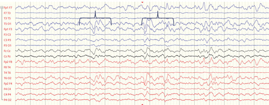 Studies that have incorporated EEG-based measures as a means of identifying PTE, though initially unsuccessful [25], were able to identify several electrographical markers that are reliable risk factors for PTE among adult patients after TBI. These include increases in the delta/theta power ratio and overall power in this range [25], sporadic epileptiform discharges, and focal polymorphic slowing during the acute period following TBI [26] (Figure 2). Another multi-center study [27] using qEEG measures showed that greater epileptiform activity, delta asymmetry, and lateralized rhythmic delta activity were associated with an increased risk of unprovoked seizures in adults. Recently, Guerriero et al. [28] identified a novel pattern termed macro-periodic oscillations (MOs), a distinct slow periodic pattern of oscillations every 2 to 5 min, which is significantly associated with an increased risk of electrographic seizures in children admitted to the ICU.