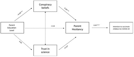 Path analysis model for the intention to vaccinate children against COVID-19. Legend: *** p < 0.001; * p < 0.05; all the values are betas, except for † which is odds ratio.