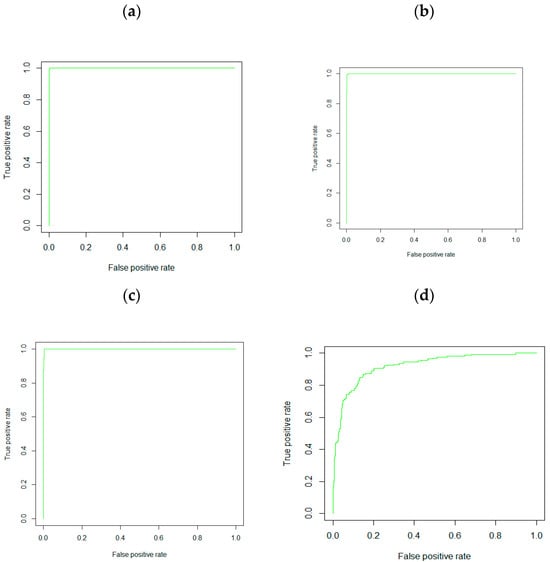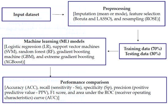 The performance of ML methods was evaluated by measuring the accuracy (ACC), recall (sensitivity—Sn), specificity (Sp), precision (positive predictive value—PPV), F1 score, and area under the ROC (receiver operating characteristics) curve (AUC). The R packages used included “caret”, “kernlab”, and “ROCR”. The confusion matrix is illustrated in Table 1.