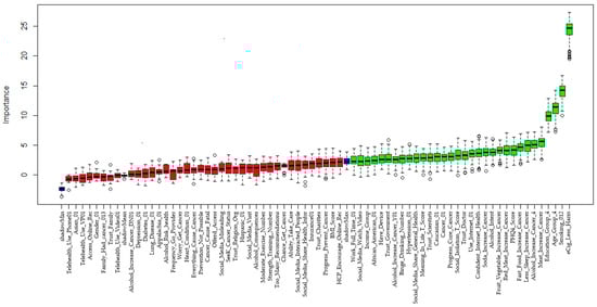 Boruta [] and LASSO [] were used to select variables associated with the binary outcome. The Boruta algorithm in R (Version 4.4.2, R Core Team, Vienna, Austria), specifically the “Boruta” package, was used to automatically perform feature selection on a dataset using a random forest (RF) classifier []. The LASSO method in the R package “glmnet”, was also used to perform feature selection [], which regularizes model parameter λ by shrinking the regression coefficients, reducing some of them to zero. The feature selection phase occurs after the shrinkage, where every non-zero value is selected as a parameter in the model. Considering the potential imbalanced data of two classes of current e-cigarette use (yes, no), the random oversampling example (ROSE) method was utilized. The method = “both” was selected, where both the minority class is oversampled with replacement and the majority class is under sampled without replacement [].