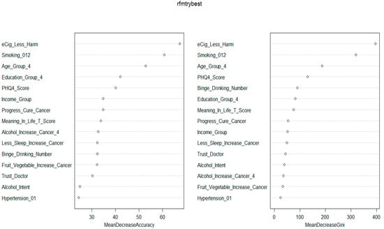 The LASSO method selected 30 features based on the optimal parameter ln(λ) = −5.99 (Figure 2 and Supplementary Table S1). Boruta selected 32 variables (Figure 3 and Supplementary Table S1). Boruta and LASSO selected 15 identical variables (Supplementary Table S1), which were used for developing ML tools. Figure 4 illustrates how the 15 selected variables performed via the RF algorithm. Based on the mean decrease accuracy, the top seven variables were belief in harm of e-cigarette use, smoking status, age, education level, belief in alcohol increasing cancer, belief in less sleep increasing cancer, and PHQ4 score (Figure 4 and Supplementary Table S1). PHQ4 score was used to assess the degree of depression severity via a questionnaire.