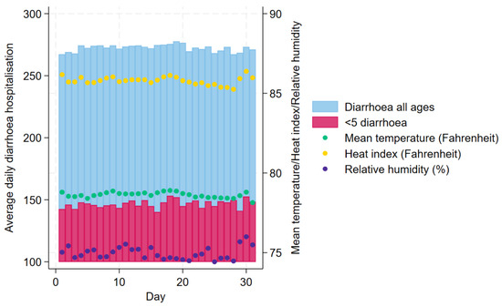 Daily distribution of diarrhoea hospitalisations in all ages and children under 5 years old and Heat Index, ambient temperature, and relative humidity averaged between 1981 and 2010 in Dhaka, Bangladesh.