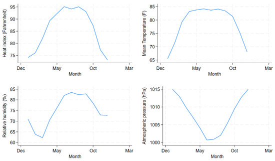 Monthly distributions of the daily mean temperature (F), daily relative humidity (%), daily atmospheric pressure (hPa) and Heat Index (Fahrenheit) from 1981 to 2010 in Dhaka, Bangladesh.