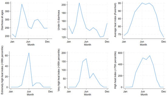 In addition to young children, males were found to be at a slightly higher risk of diarrhoea due to extremely high (14.2% vs. 10.4%) and high HI (10.1% vs. 8.4%) compared to females. However, compared to males, females were found to be at slightly higher risk for very high HI (10.2% vs. 10.8%). A few studies that have investigated the impact of HI on cardiovascular disease mortality have reported a greater vulnerability of females to the effects of HI owing to their pathophysiological responses to heat stress [19,49,58,59]. The inconsistency noted in this study suggests that additional factors, including social and living conditions [60], social behaviour, amount of time spent outdoors vs. indoors, and healthcare-seeking behaviour, likely also modify the effect of HIs on diarrhoea hospitalisations. Future studies focused on identifying vulnerable groups based on the impacts of HIs on specific morbidities could shed further light on the modifying role of gender.