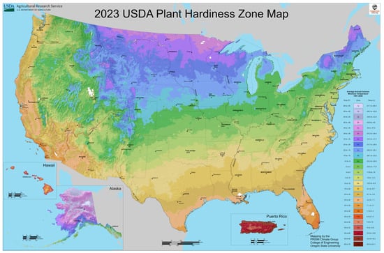 - USDA. 2023 USDA Plant Hardiness Zone Map. Available online: https://planthardiness.ars.usda.gov/ (accessed on 8 September 2024).
