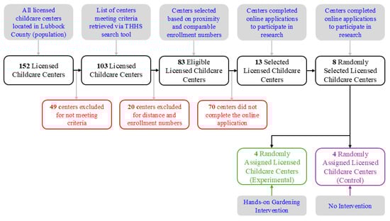 A list of 103 licensed childcare centers in Lubbock County was retrieved from the THHS online childcare search tool based on these criteria. The list was then refined to 83 eligible centers based on proximity and enrollment numbers. Driving distance from the university campus was important, as the research team needed to visit centers multiple times for data collection and garden setup. Centers with low enrollment numbers were excluded to ensure comparability in sample size. An online call for applications, facilitated by the Texas Workforce Commission (TWC), was sent to the 83 eligible centers, resulting in 13 completed applications.