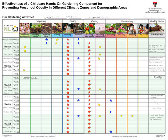 Each center received a wall chart measuring 36″ × 48″, organized into cells representing gardening activities (across the top) and calendar dates (along the left), with additional space for weekly notes on the right. The chart was displayed in a location visible to the children. During the morning outdoor garden sessions, teachers reviewed whether any gardening activities had taken place, and if so, stickers were applied to the corresponding cells. Each activity could receive a maximum of five stickers per week, with a total potential weekly score of 60. After five weeks, research assistants (RAs) collected the charts for further analysis.