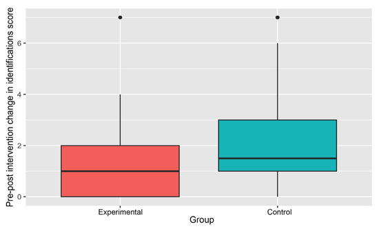 Pre-post mean identification scores and their changes in Experimental and Control Groups.