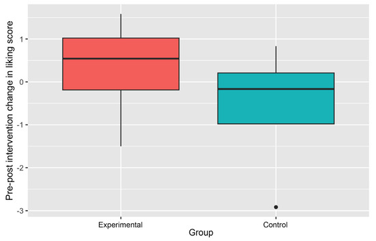 Changes in the Liking scores have been presented in Table 4. The pre-intervention average Liking scores were slightly higher in the Control Group. However, changes in average Liking scores were generally positive in the Experimental Group (except for fruits), implying improved Liking, but the changes are consistently negative in the Control Group, indicating increased disliking.