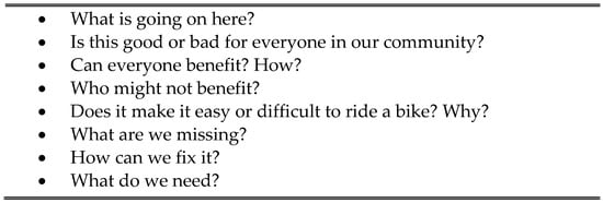 All steps of analysis were guided and reviewed by the PI. All three citizen science walk audits used the same three deductive codes. The pictures collected from each walk were kept separate for coding and categorization to support trustworthiness through credibility and consistency [44]. Deductive codes were applied to the pictures and narrative explanations by each medical student researcher. The data was triangulated through multiple review meetings with student researchers and the PI. Discrepancies in coding were addressed through collaborative discussion with final group identification of a single code or consensus that an image was appropriate for the code, multiple codes, or a new code. The images from each of the three walks were then organized by the deductive code and provided to each walk focus group. The facilitated focus groups used guiding questions (Figure 2) to review and discuss the images grouped by deductive codes. Participants reviewed images and wrote narrative explanations addressing guiding questions, solutions, and concerns. The narrative data from the focus groups was used for deeper exploration into the meaning of data through the use of inductive analysis provided authenticity and rigor to the study. Focus group narrative data were organized and used to identify patterns, categories, and emerging themes [44,45]. Inductive codes were then created to further delineate participants’ lived experience as they explored the accessibility of the bike share program. The written notes and flip charts for each focus group were reviewed by each student researcher to identify patterns. Student researchers added summary notes and observations. The PI documented narrative notes from the focus group members and student researchers in an Excel file for each walk to provide clear organized narrative data. These steps were reviewed by student researchers to verify authenticity. Next, codes and patterns were vetted by each student independently. The students and PI further vetted and triangulated data through three separate review meetings focusing first on each walk and next on exploring data across all three walks. Final emerging themes and categories were established.