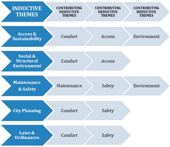 Inductive analysis of citizen science focus group participant reflection, guided discussion, and written observations of the walk image data identified five themes that embedded SDoH. These themes expanded on the deductive coded themes (Figure 3) as follows: (1) Bike share Access and Sustainability: Focused on technology, ease of use, technology literacy barriers, and language barriers. It also addressed concerns with bike access and bike recovery to ensure reliable transportation. (2) Social and Structural Environment: Incorporated accessibility topics, comfort, and the importance of developing a supportive infrastructure. In addition, convenience and availability of bikes were addressed with the need for additional bike rack stations. This would increase rider access to essential services and increase reliable transportation for ride destinations. Final concerns focused on ease of use accessing bike locking systems and the cost of the bike share program. (3) Maintenance and Safety: Addressed the environment, including the condition of sidewalks, streets, and green space/parks. This theme also addressed bike repair and function (charging for e-bikes) and concerns with accessible Wi-Fi and limitations in the usability of the bike share app due to slow or weak Wi-Fi signals. (4) City Planning: Focused on the need for infrastructure to increase useability and safety for bike share use. This included the need to complete sidewalks, create safe bike lanes for street transit, and add signage. Additional city planning suggestions included development of path connectivity, increased safety, American Disabilities Act (ADA) crosswalks [47], crosswalk lighting, and flashing lights (pedestrian light-controlled crossing) for inclusive biking access. (5) Laws and Policies: Addressed concerns with current city ordinances banning or limiting bike travel on city sidewalks. It also addressed concerns of the need to reduce and enforce speed limits on neighborhood streets where cars and bikes shared the road (Figure S2).