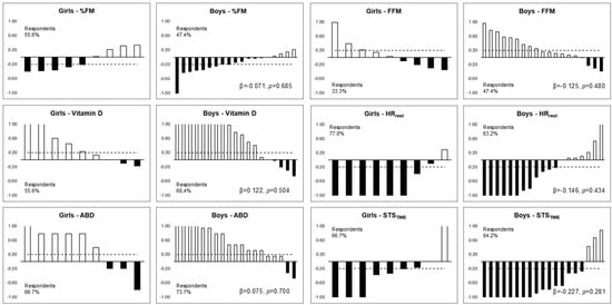 Figure 1 shows the respondents’ frequency of body composition, 25(OH)D, HRrest, abdominal resistance strength, and motor performance among boys and girls. No differences were observed in the frequencies of respondents and non-respondents between the sexes three months after returning to school. The proportions of change in respondents were similar, respectively, for girls and boys, for %FM (55% and 47%), 25(OH)D (55% and 68%), HRrest (77% and 63%), abdominal resistance (66% and 73%), and STSTIME (66% and 84%).