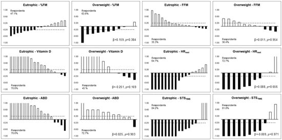 Figure 2 shows the respondents’ frequency of body composition, 25(OH)D, HRrest, abdominal resistance strength, and motor performance between eutrophic individuals and overweight individuals. No differences were observed in the frequencies of respondents and non-respondents between eutrophic individuals and overweight individuals three months after returning to school. The proportions of change in respondents were similar, respectively, for eutrophic and overweight individuals, for %FM (47% and 63%), 25(OH)D (70% and 45%), HRrest (64% and 72%), abdominal resistance (70% and 72%), and STSTIME (84% and 81%).