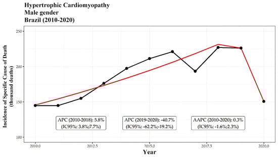 The downward trend in the incidence of death from hypertrophic cardiomyopathy between 2019 and 2020 could be explained by the convergence with the period of the COVID-19 pandemic. The underreporting of deaths from cardiovascular diseases during the health crisis has been noted. This is corroborated by a study developed by Normando et al. (2021) [], who analyzed the impact of the pandemic on the number of hospitalizations and hospital deaths due to cardiovascular etiologies in a comparative study between the year 2020 and the period from 2016 to 2019.