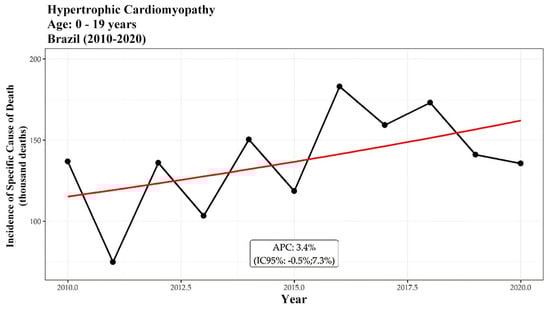 Given the relevance of this disease and considering its high incidence, even when underdiagnosed, the objective of the present study was to evaluate the mortality due to HCM in Brazil from 2010 to 2020. This analysis includes the association of sociodemographic data related to mortality rates, as understanding these factors is crucial in identifying disparities in health outcomes across different populations [].
