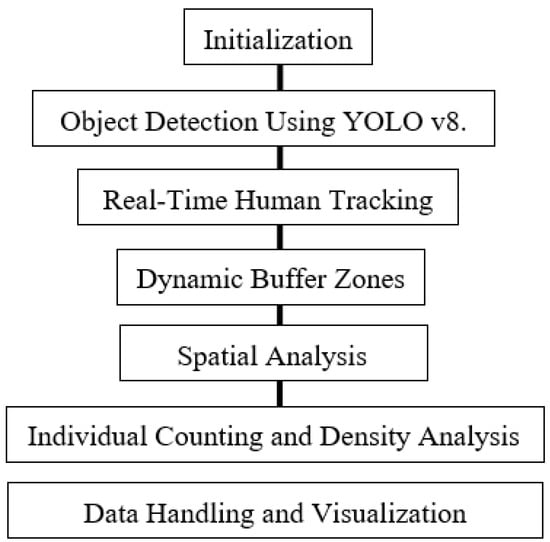 Flowchart; steps include initialization, object detection using YOLOv8, real-time human tracking, dynamic buffer zones, spatial analysis, people counting and density analysis, and data handling and visualization.