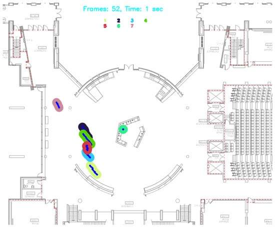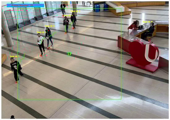 The captured video spans a duration of 30 min, recorded during peak hours when the atrium is most populated, to ensure a representative sample of typical occupancy and interaction patterns. For the purposes of this paper, a 31 s sequence from this footage was selected to create the tables and figures presented here. The high-definition video resolution facilitates precise object detection and tracking, which are crucial for the subsequent analysis stages. The clarity and stability of the footage significantly contribute to the accuracy of the detection and tracking processes, enabling the software to generate reliable data on contact rates and movement patterns.