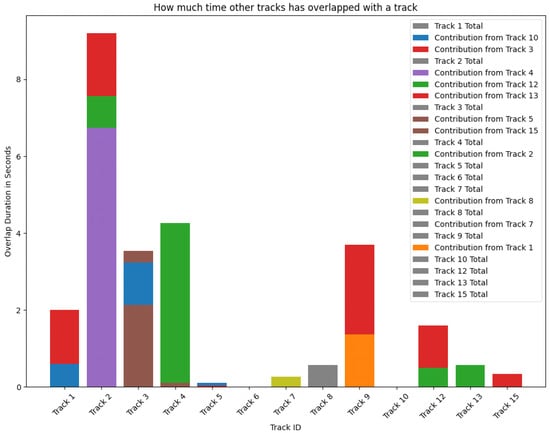 In addition to quantitative assessments, visual tools such as those depicted in Figure 3 offer insights into the dynamics of interactions within a monitored indoor environment. This figure succinctly illustrates the cumulative duration of close-contact interactions among individuals, captured and tracked by our sophisticated software system throughout a 31 s video sequence in Vari Hall, York University. Each bar on the chart, segmented by color, represents a unique track ID, with the colors denoting the duration and frequency of overlap with other tracks. This segmentation effectively highlights the patterns of proximity between individuals that are critical for evaluating the potential risk of respiratory disease transmission.