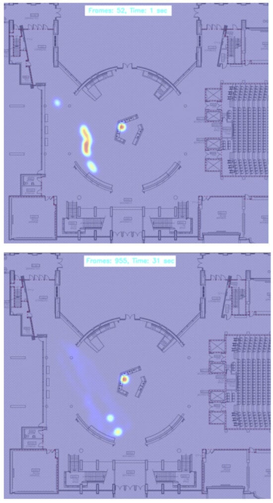 In the intricate assessment of spatial dynamics and interactional ecology within enclosed settings, the deployment of the dual heatmaps, as illustrated in Figure 5, emerges as a fundamental visualization tool. These heatmaps, developed from video captures at frames 52 and 995 during our experiment, elucidate the spatial distribution and mobility patterns of individuals over time. The gradations of color intensity across the heatmap delineate varied levels of interaction frequency and duration, thereby demarcating distinct zones of interaction. This stratification is pivotal in discerning areas characterized by elevated interaction densities—zones potentially susceptible to heightened disease transmission. Such graphical representations are invaluable for their profound utility in dissecting complex spatial and temporal patterns of human interaction within confined spaces. By synergistically augmenting the empirical insights garnered from Table 1 and Figure 2 and Figure 3, the heatmaps transcend conventional analysis, offering an immediate, visual synthesis of spatial utilization and interaction dynamics over designated intervals.