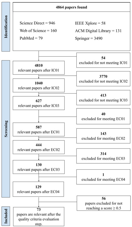 After identifying and defining the initial set of records, screening was performed to select a subset of eligible primary studies. This process was organized and executed applying three elementary procedures: (i) Inclusion Criteria—IC; (ii) Exclusion Criteria—EC; and (iii) Quality Assessment Criteria—QA.