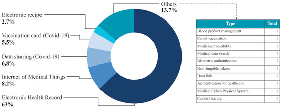 Based on the studies included, and as can be seen in Figure 2, blockchain technology has been used in the context of health information system applications in scenarios such as electronic health records, Internet of Medical Things, data sharing in the fight against COVID-19, COVID-19 digital health passports, and e-prescriptions, among others, which had only one occurrence and are also listed in Figure 2.