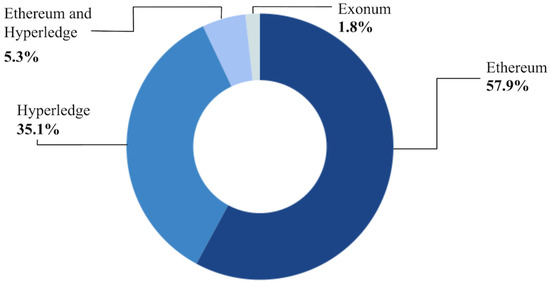 Of the 73 articles included, only 57 gave more details about the blockchain structure used to develop the proposed solution. As Figure 3 shows, 33 (57.9%) used Ethereum, 20 (35.1%) used some version of Hyperledger (Hyperledger Fabric, Hyperledger Aries, and Hyperledger Indy), with Hyperledger Fabric being the most used in 18 of the cases listed. Only three (5.3%) of the papers still used both Ethereum and Hyperledger in their solutions [90,94,95]. In addition to the main platforms mentioned above, one of the papers used Exonum, an open-source blockchain structure [69].