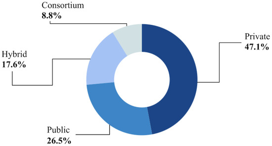 According to the definitions and what was presented, 34 studies directly cited that their networks were configured with one of the permissions methods mentioned; of these, 16 (47.1%) were private networks, 9 (26.5%) public, 3 (8.8%) consortium, and the remaining 6 (17.6%) used more than one of the methods and were classified for this systematic review as being hybrid, as shown in Figure 4.