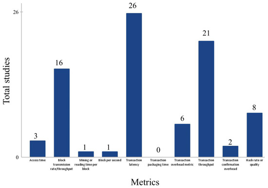 Another relevant point to be analyzed is the use of metrics to measure the performance of the blockchain implementation. To understand the parameters used to evaluate the performance and quality of the solutions included in this review, we analyzed the metrics most commonly employed in these studies. It was used as a reference the metrics cited in Ebad (2023) [103] and selected the following: