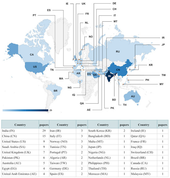 In order to visualize the geographical distribution of the articles included in this review, the analysis was carried out considering the countries of each of the authors. Thus, in some cases, an article was developed by researchers from different countries, an aspect that denotes international scientific cooperation on the subject of blockchain. Figure 7 illustrates the distribution of research related to the use of blockchain in health information systems worldwide. In terms of countries, India stands out significantly, as the majority of the articles selected for this review were conducted by institutions located in this country, with a total of 29 articles. China followed with 15 studies, while the United States and Saudi Arabia conducted 9 studies each. The United Kingdom contributed 7 studies and Pakistan 6 studies; more details are available in Figure 7.