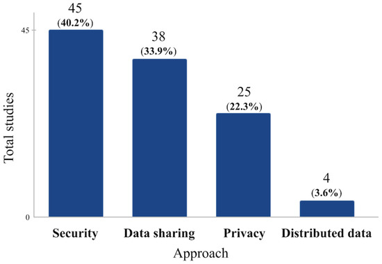 It is important to note that most of the studies considered more than one of these approaches; for example, they sought to solve problems of privacy and security, data sharing and security, and distributed data and privacy. We therefore sought to select the one that was most relevant to the problem that this work set out to solve. In cases where the focus was on more than one of the approaches and there were insufficient criteria to choose just one of them, the studies were related to more than one, i.e., two approaches were counted.