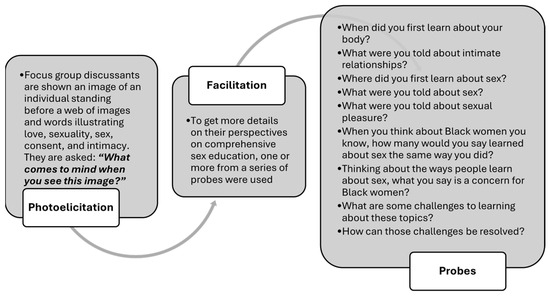 The study team developed topics and probes for the focus group discussion (FGD) guide based on a review of sexual and reproductive health literature. A photo-elicitation method was used to evoke narratives around each FGD topic in the guide. Participants were shown an image related to the topic of sexuality education and asked to speak on what came to mind. Probes were used to elicit greater detail on the narratives raised. An illustration of the process used in addition to a sample of the probes is captured in Figure 1. Based on findings from the few existing CBPR qualitative studies among Black people that demonstrate the failings of AOUM programming and a desire for high-quality CSE with open communication on diverse content [12,27,28], we hypothesized that our participants would describe similar experiences with AOUM programming and its limitations, as well as a preference for CSE.