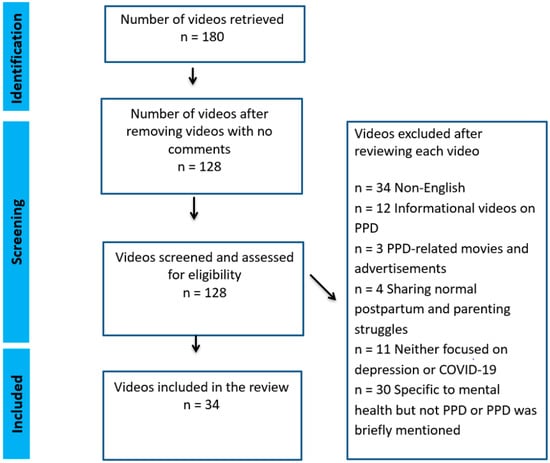 Figure 2 shows the PRISMA flow diagram for the eligible video selection. We identified thirty-four eligible videos that focused on people’s firsthand experiences of PPD. These videos were created by affected parents and/or family members, or by newscasters, podcasters or YouTubers through interviews or by compiling publicly available news about affected individuals.