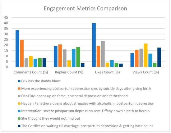 We conducted the engagement metric analysis of thirty-three YouTube videos. These metrics included the number of comments, replies, likes, views, and hashtags. The growing popularity of social media allows users to engage in activities such as creating profiles, interacting with others, expressing opinions and emotions, and sharing firsthand experiences. When users engage with posts through comments, replies, likes, and views, algorithms interpret this as valuable content, increasing its visibility. These metrics reflected the video’s popularity and high audience engagement, offering real-time data that captures current public perceptions of PPD and allows for monitoring changes over time [31,34].