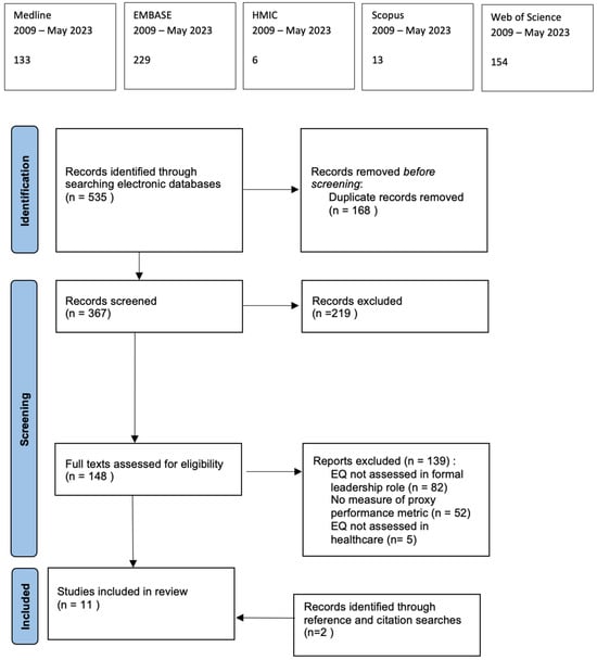 The search retrieved 535 records, of which 368 abstracts were evaluated by the author with regard to their compatibility with the inclusion criteria (Table 1). Subsequently, 148 full texts underwent assessment for eligibility. Following screening of the reference lists and citations, a total of 11 studies were found to assess the impact of leaders’ EQ on proxy performance metrics (Figure 1). Ten of these studies collected data at a single point in time using structured questionnaires. The remaining paper was a prospective longitudinal cohort study (Table 2).