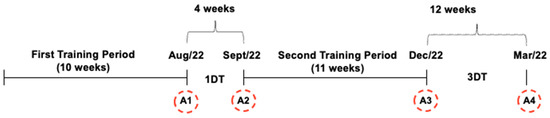 The two evaluated pause periods correspond to the mid-year and end-of-year breaks that occur in PROCOR’s community offerings. The assessments conducted at the end of the first training period and the beginning of the second training period of 2022 were used to evaluate the effects of approximately 1 month of detraining (1DT), and those conducted at the end of the second training period of 2022 and the beginning of the first training period of 2023 were used to evaluate the effects of approximately 3 months of detraining (3DT), corresponding to detraining periods of 4 and 12 weeks, respectively (Figure 1).